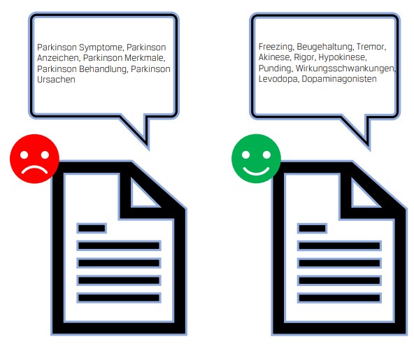 Der Inhalt links behauptet, dass er sich um „Parkinson Symptome“ drehen würde, immerhin steht das Keyword häufig und an den richtigen Stellen wie H1 und HTML-Title auf der Seite, ebenso wie die Synonyme „Anzeichen“ und ergänzende Themen wie „Behandlung“ und „Ursachen“. Das sagt aber nichts über die Qualität des Inhalts aus. Der Inhalt rechts stellt keine Behauptung in Form von Schlagworten auf, sondern die verwendeten Begriffe im Text selbst belegen, worum der Text sich dreht. Durch Updates wie Rankbrain, BERT und MUM weiß Google, dass Freezing und Akinese Parkinson Symptome sind, ohne dass die Website aufdringlich behauptet, sich mit Symptomen zu befassen. Die weiteren Bewertungen auf Basis von E-A-T und Natural Language Processing, sowie der Vergleich mit tausenden anderen Suchergebnissen zum Thema ermöglicht dann, die Inhalte auch qualitativ zu bewerten. Das ist natürlich stark vereinfacht ausgedrückt, veranschaulicht aber sehr praxisbezogen, warum konkrete Keywords auch in der Redaktionsplanung immer unwichtiger werden. Stattdessen sind die Themen- und Strukturplanung, sowie die Entwicklung eines guten Content-Mixes zu möglichst vielen relevanten W-Fragen zu einem Thema relevant, der zudem evidenzbasiert, holistisch und seriös ist.