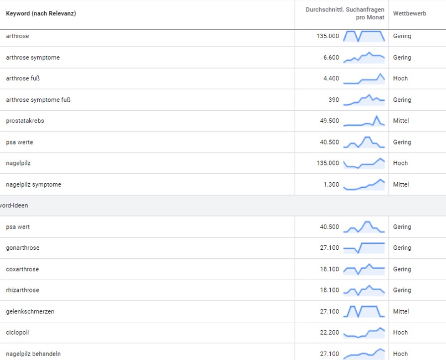 Auszug aus dem Google Keyword-Planer. Zählt man alle möglichen Keywords eines Themas wie „Arthrose“ oder „Nagelpilz“ zusammen, so kommt bereits einer dieser Themenkomplexe allein auf ein Suchvolumen von gut mehreren hunderttausend Suchanfragen pro Monat.